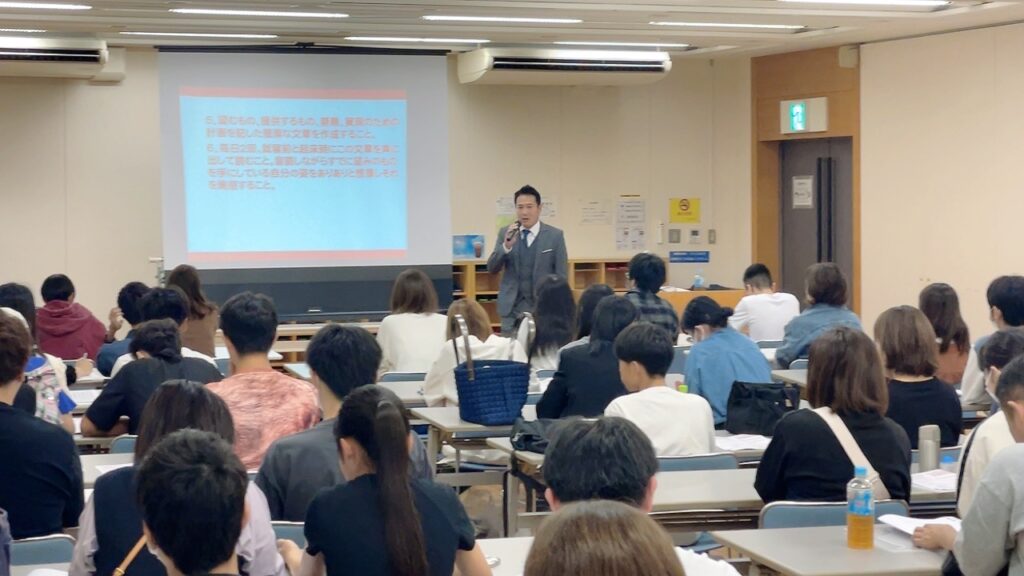 第1回は6月に住吉区民センターで開催しましたが、今回は長居スタジアムに併設されている「長居ユースホステル」にて行いました。10月以降の受験生のスケジュールをはじめ、私立高校・公立高校の選定時に気を付けることを中心に安延先生がお話してくれました。