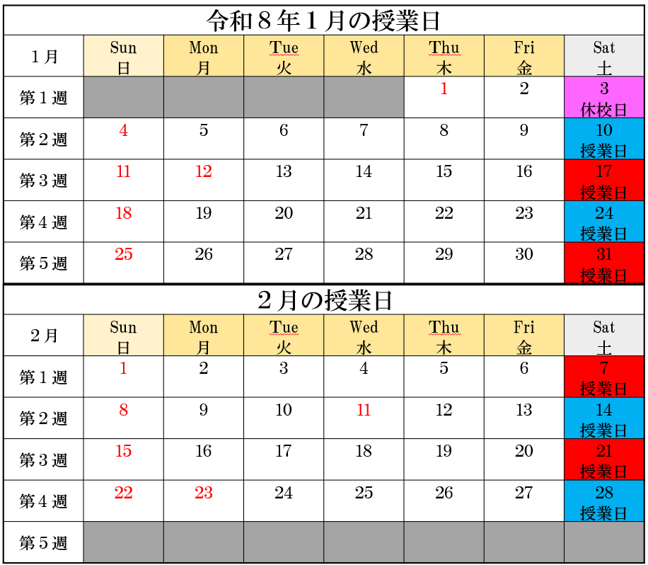 1月・2月の予定は以下の通りとなっております。令和8年1月3日(土)を休校日とさせていただきましたので、1月31日(土)を授業日とさせていただきます。1月は通常とは異なり、第5土曜日に授業がございますのでご注意ください。