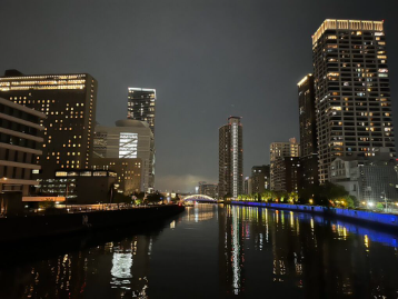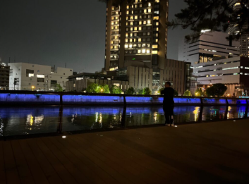 高層ビルの明かりが水面に映り込み、川沿いのライトアップと重なって、都会的でありながらどこか落ち着いた雰囲気が漂っていました。写真に写る景色も、実際に歩いてみると、音も少なく、時間がゆっくり流れているように感じられます。