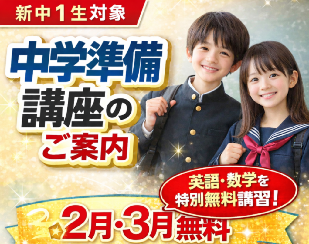 2月から新中1生を対象とした中学準備講座を開講いたします。この講座では中1の4月からスムーズなスタートを切れるように、中1内容の英語と数学を先取りで行います。創心館の新中1生だけでなく、まだ塾へ通ったことのない方も参加できます。校舎によって開講曜日が異なりますので、他の習い事のご都合に合わせて受講いただけます。詳細につきましては、以下の画像をタップしてご確認ください。