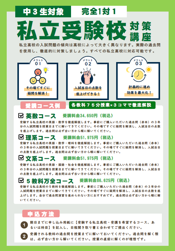 通常授業をきちんと受けている人はこのコースを受講してください。通常授業と連動したカリキュラムを組んでいますので、この講座で、今まで学んだ知識を確実なものにすることができます。知っていると使えるは違います。この長期休みに今までの総復習をしておいて、新たな気持ちで3学期を迎えることができるようにしましょう。